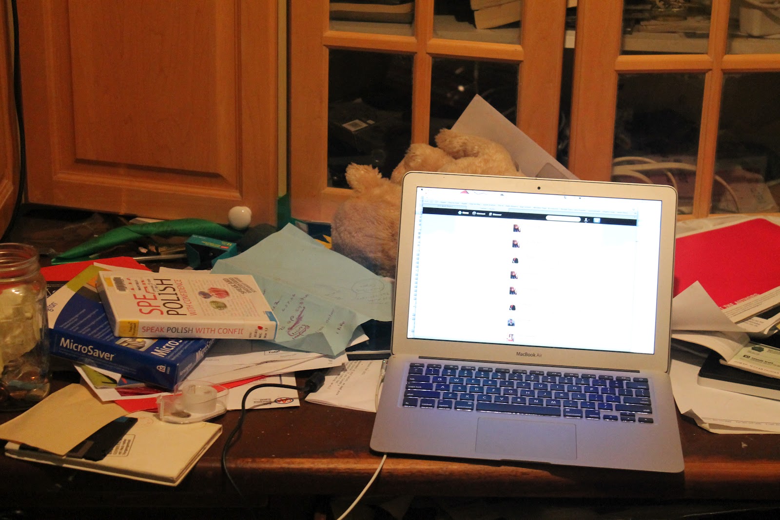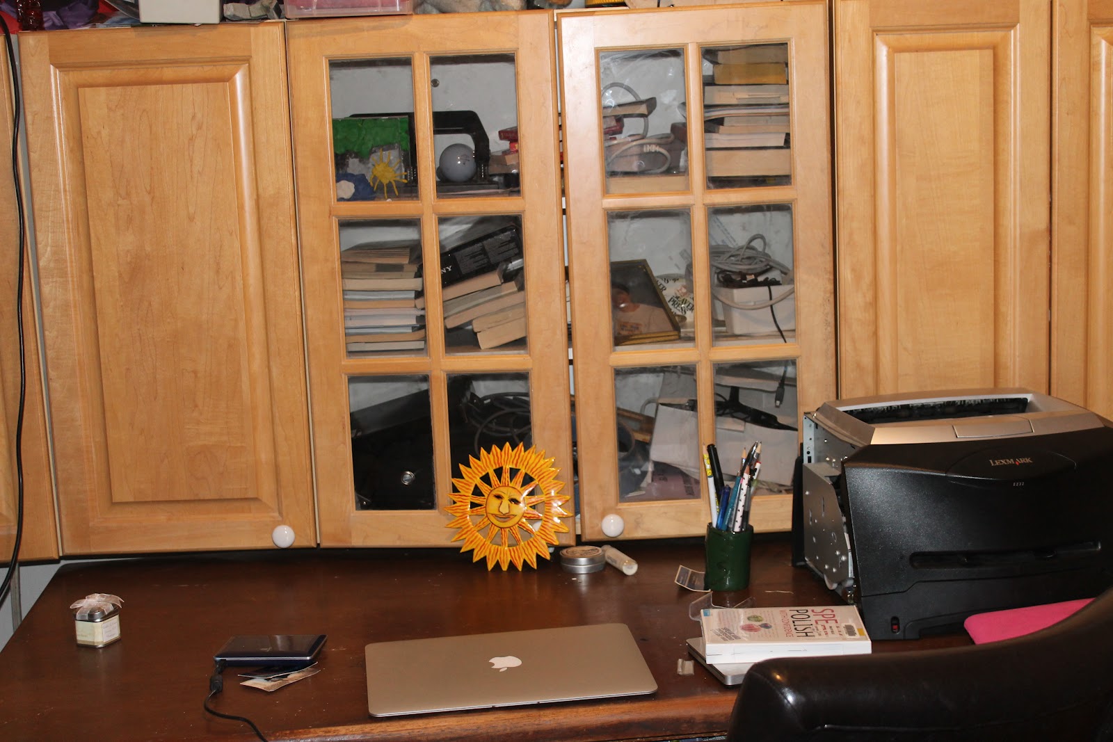 Step 6 An hour later: Wash desk and floor with vinegar and water. Dry desk. It's starting to almost look good! Step 7 Take "after" photo of desk. True the whole office is not perfect yet. You can't see all the author props piled up on top of the cupboard in this photo. My spare brain, my rubber chicken, three dog stuffies, a snare pole, a tiger and an identicane. Still it may never be this clean again and we must celebrate the steps along the way! The floor looks like floor now too but it's not what we in the business call a real photo op. Just imagine dark brown parket with a tile missing.
