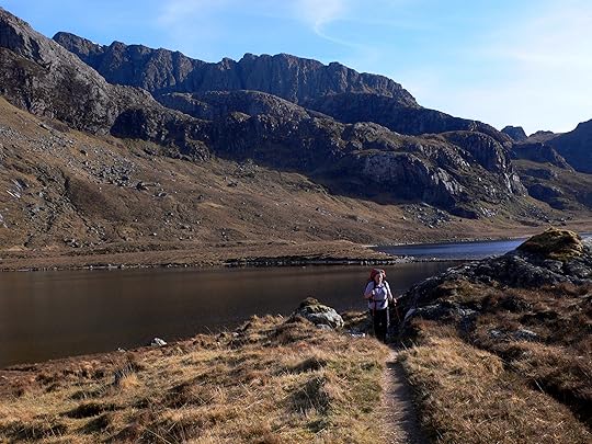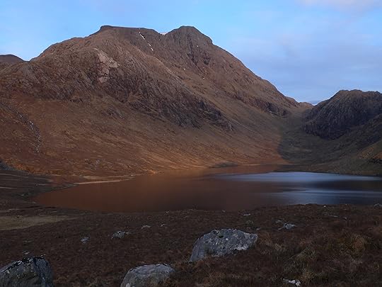 Passing the Dubh Loch on the long walk-in from PooleweThe long walk-in is a fine way to court this particular maiden. (A’Mhaighdean can be translated as ‘the maiden’ although Peter Drummond, in his excellent Scottish Hill and Mountain Names, points out that in both Scots and Gaelic cultures a maiden is also the last sheaf of corn cut during the harvest. There are many Highland traditions associated with this last stook when, after a good harvest, it would be dressed to look like a young girl. You certainly notice a likeness to a sheaf when you look at the summit from the west.)The long walk-in from Poolewe allows you time to ease yourself gently into this marvelous landscape, by way of Kernsary and the Fionn Loch. Stay in a tent or use the bothy at Carnmore. Whatever way you approach these hills the undoubted highlight is the ascent of A’Mhaighdean from Carnmore.On one memorable ascent my wife and I walked in from Poolewe and camped close to the causeway between the Fionn Loch and the Dubh Loch. A’Mhaighdean’s ‘stook’-like summit dominated the view from the tent door. Nearby the house at Carnmore was locked up and I recalled Tom Weir’s stories about the Macrae family who once lived there. Over the years Tom got to know the family quite well and he was always made very welcome. That was probably in the nineteen-forties or fifties. Estate guests now use the house, although the nearby bothy is always available but be warned, it’s a little less than basic!We felt more comfortable in our tent and a memorable camp it turned out to be. The sunset, reflected on the waters of the Fionn Loch, was as spectacular as any I’ve seen, a slowly changing kaleidoscope of rich red and yellows and purples fading to a delicate pink. We lay outside the tent, dram in hand, desperate to tease out every last second, before the midges drove us inside to our sleeping bags.
