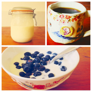 Homemade yogurt on the left is perfect with coffee. On the bottom, add in some blueberries and, if you like, some rhubarb / rose simple syrup (I made too much this weekend and it’s amazing how great it tastes in EVERYTHING from soda water to ice cream).