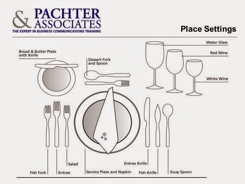 4. As a general rule, navigate your place setting from the outside in. Each course should have its own utensils. Additional information on place settings and dining can be found in my new book, The Essentials of Business Etiquette: How to Greet, Eat, and Tweet Your Way to Success.