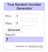 Seven people entered my newsletter sign-up contest, so I used a random number generator to select a random number from 1-7, with entrants being assigned the number associated with the order in which they signed up.