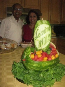 My parents posing with the fruit salad that my father carved when my first book came out in 2009. Thanks, Pappa!