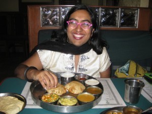 Eating a fabulous South Indian thali while talking with Sunil Menon, one of my activist heroes, a pioneer of HIV/queer organizing in India.
