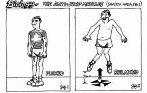 I remember an old comic by the cartoonist R. Kliban, who did a lot of stuff in the 70s and 80s, including several about cats that you may have seen somewhere. The one that always stuck in my mind was “Anti-Jump Muscles”: