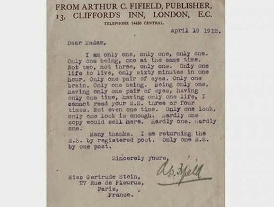 I don't know why, but I can't help finding the old rejection letters of people who went on to find huge success in life amusing. It shows that the gatekeepers don't know as much as they tell you they know, and so much in the arts is subjective. The following link will take you to a site where there are a handful of these old rejection letters that people like Andy Warhol and yes, even Gertrude Stein received.