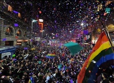 A look at hundreds of gay rights supporters in a fight for equal rights dance and cheer during the annual Gay Pride Parade in Montevideo, the capital of Uruguay.