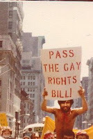 Here's the caption: This picture was taken of me in NYC for the Pride March in June 1978. We marched up 6th Avenue then. (We were not allowed to march up 5th Av. thanks to the Catholic Church). The placards we were holding were for the city of New York to pass an anti-discrimination bill for housing and jobs for gays and lesbians. We have come a long way since 1978. We still have far to go, but tomorrow will be an incredible day in New York.