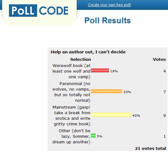 Werewolf book (at least one wolf and one vamp)Paranormal (no wolves, no vamps, but so totally not normal)Mainstream (gasp! take a break from erotica and write gritty crime book)Other (don't be lazy, Sommer, dream up another) pollcode.com free pollsDecember 6, 2010