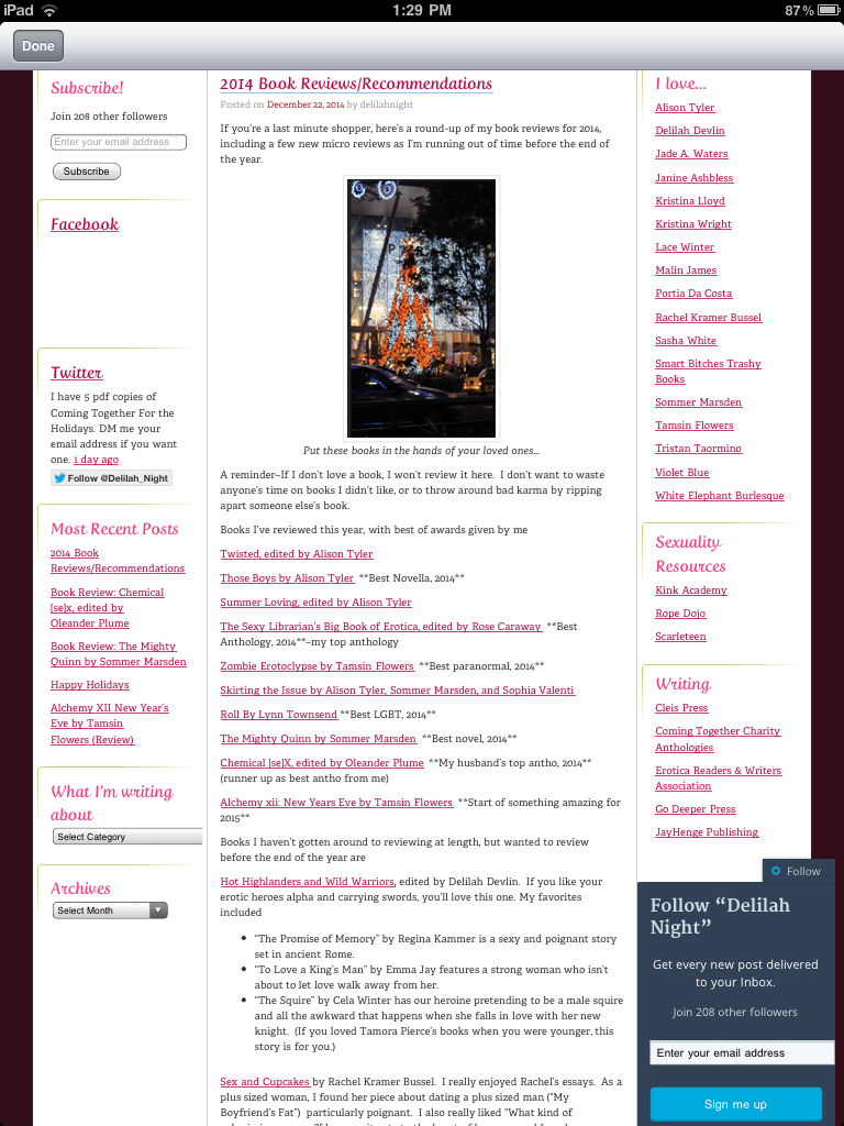 She also gives nice complimentary strokes to Twisted edited by Alison Tyler, the novella Those Boys by Alison Tyler, Skirting the Issue, the multi-indie-author that includes me, Sophia Valenti and Alison Tyler, The Sexy Librarian's Big Book of Erotica edited by Rose Caraway and...gasp!...so many others.