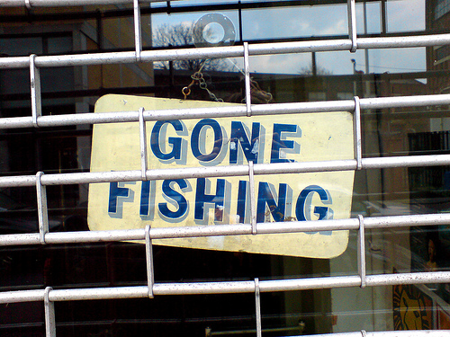 This sign was true! As it stands, I am not fishing, but wanted to put something up to let people know I am blogging sporadically but will be back soonish.Tuesday, May 21, the man was admitted to the hospital. He is better than he was that day but not enough to be sent home. So...I am out. A lot. And my schedule is all wonky. So, if you're used to my regular babble here, it will be off for a bit. And if you're looking for emails from me, they might be late.