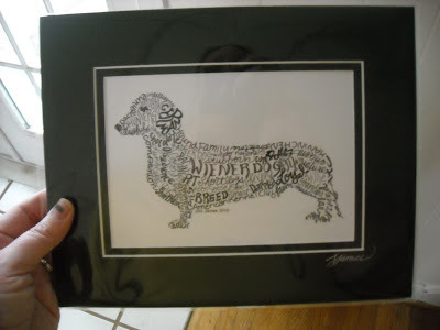 birthday greetings setting atop a big box that contains my brain...I mean iPad. And below that a gift from lovely May Deva! A wiener for the wall. And look...I have a naked spot on the wall. (Um...I took a pic down for a Halloween sign and um...lost it...)