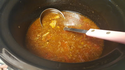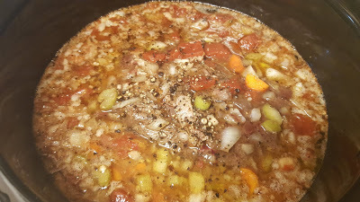 Since it is NOT cold here I followed the instructions up to the part where the roast goes in the oven for two hours, instead I put everything in the crock pot on high for four hours.
