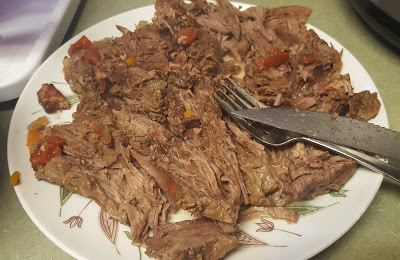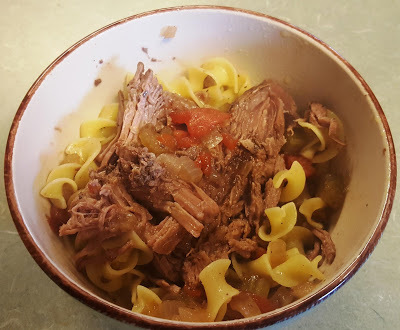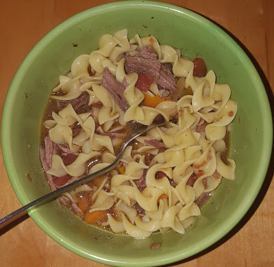 Since the roast cooked in a crock pot it didn't slice, it pretty much fell apart so I basically shredded it. Which was actually great. I put the noodles and shredded roast into a bowl and topped it with the liquid and veggies (which I didn't squish or strain out. I left them in to give it texture. I like veggies. Sorry I seem absolutely incapable of following a recipe to a T. I always change something).