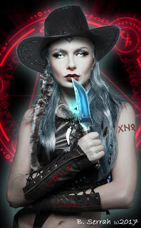 A woman flickered into existence. As if stepping out of some eternal veil, she appeared without warning and made straight for Serenity in quick, purposeful strides. The wide, swooping brim of a black cowboy hat hid her eyes; long silver hair streamed out behind her like a pale, gossamer banner. The lithe curves of a predator couldn’t be hidden underneath her black corset and boiled leather leggings—sleek animal fur lined the tops of her boots, tribal moccasins dyed with deep ink and painted with runic markings along the seams.
