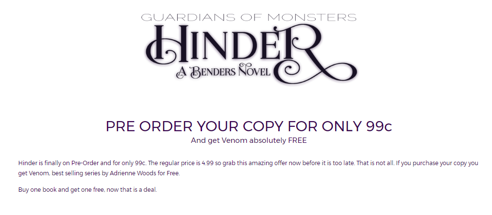 PRE ORDER HINDER FOR .99 Yes, you’ve heard right. The pre order special is .99 only. The price will go up to $2.99 in its first month, think of it as a release day blitz, and from the second month it will go up to its normal price of $4.99. So it’s a major deal of getting the pre-order for just .99.
