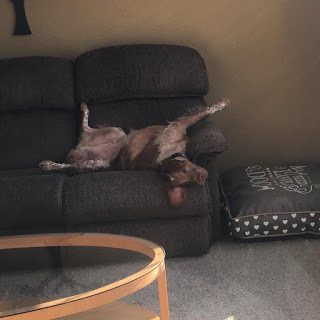 4. He changes the rules. When we brought Riptide home, he wasn’t allowed on the couch. That rule lasted about two days. His favorite thing to do now is to lie on his back on our sofa and tip his head so he can watch the squirrels out our picture window.