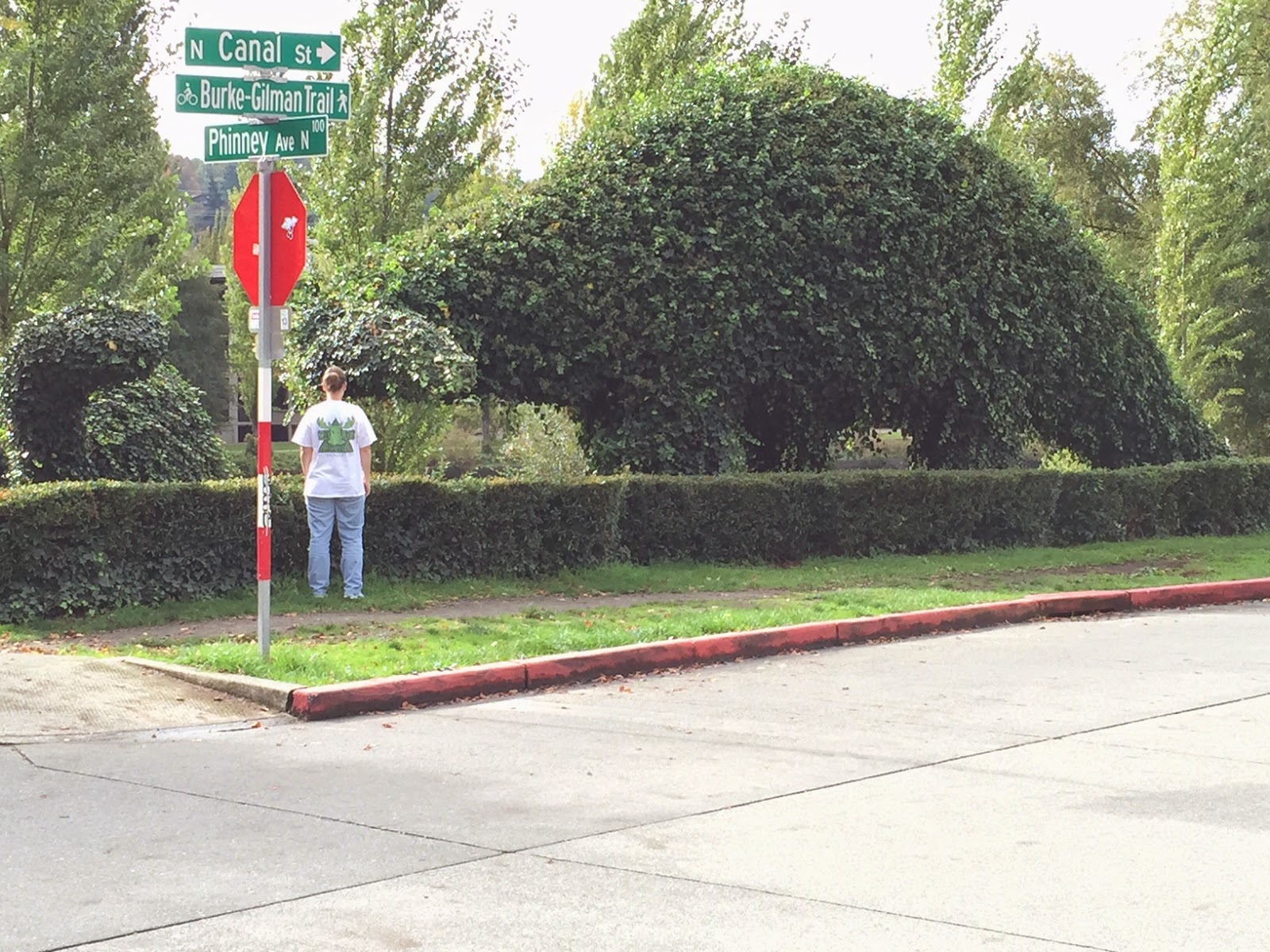 Location setting. My sister lives in Seattle. The last time I visited, I was lucky enough to tour, Theo’s Chocolates. https://www.theochocolate.comAcross from Theo’s is Lake Union, we walked along a trail, a very fine mist fell and covered our skin. We journeyed past Google’s offices and gawked at the house boats. So that moment in time stuck with me, the drizzle, the lake, the topiary so I included it in Water’s Threshold. My sister, wearing my logo, went down and took pictures by the topiary.