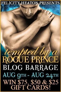 Find out how to enter the Tempted by a Rogue Prince international giveaway (ends August 24th) and be in with a shot of winning a $75, $50 or $25 gift certificate at her website, where you can also download a 6 chapter sample of the novel: http://www.felicityheaton.co.uk/tempted-by-a-rogue-prince-paranormal-romance-novel.php