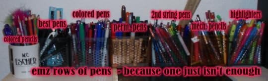 No one can visit my office without commenting on the large amount of pens on the shelves behind me. I know the reason I have a pen obsession. It’s because in my 32+ houses I lived in as a child, whenever I needed to write something – no matter what room of the house I was in – there were never any pens! It irritated the heck out of me. So much so that when I became an adult, no matter how poor I found myself, there would ALWAYS be a pen in my possession. Usually 5-6! Just imagine how frustrating it would be to be a writer and not have a writing utensil! I was not about to go the way of the Marquis de Sade and write with body fluids.