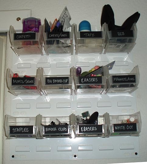 I’ve been collecting these little bins from the Container Store for awhile. They are perfect for stacking and not that expensive ($2.99 at the most). They are called Akrobins. I recently bought myself one of the wall brackets that was a bit out of my price range to hang all my bins. Now they are up and out of the way, giving me space for paperwork on my back shelves. What an ingenious invention! And look… I have space for more. Sounds like a trip to the Container Store is in order.