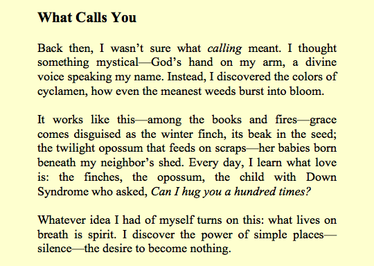 Select a topic that is risky for you and allow yourself to free-write about it. A few lines, a paragraph, a page, it does not matter. Just spend a few moments writing. Then go back to what you have written and circle a sentence or phrase. Lift it out. Using that sentence or phrase as a starting point, free-write again. This exercise is helpful in allowing you to experience how writing unfolds in layers. Note how you are moving from a surface experience to crisp details, from abstracts to images. You can try this again and again as a way to enter the heart of the matter, which then becomes powerful material for a poem.