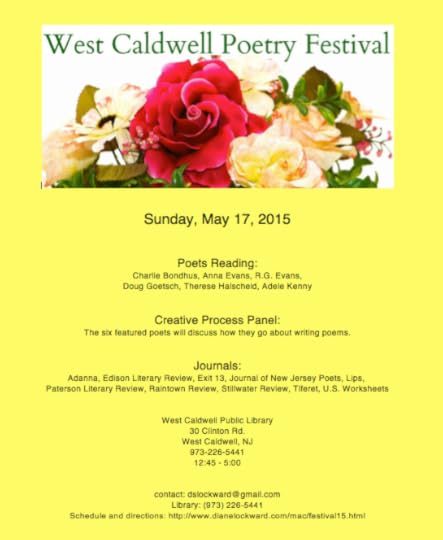 On Sunday, May 17, I ran the West Caldwell Poetry Festival, something I've been doing for the past twelve years. For the first ten years the focus was on New Jersey's literary journals. Each year I invited twelve journals to participate. Each editor then invited two representative poets to come and read. Journals were on display and for sale in the reference area while readings took place in the Community Room.