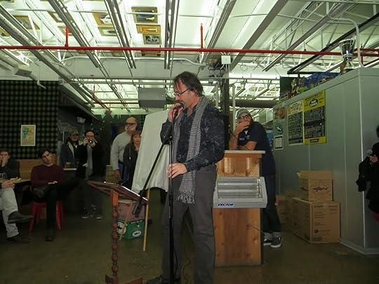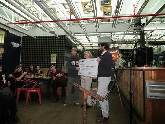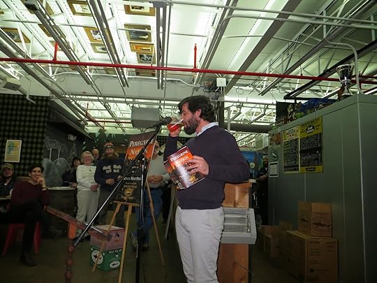 Winner Lucian Mattison reads from Peregrine Nation and pauses for a sip of beer