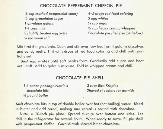 Chocolate Peppermint Chiffon Pie This is the very last piece of the pie which I intend to eat tonight. This looked even more delicious on Christmas when I made it. The chiffon has now settled just a bit. Hungry? Okay, here's the recipe: