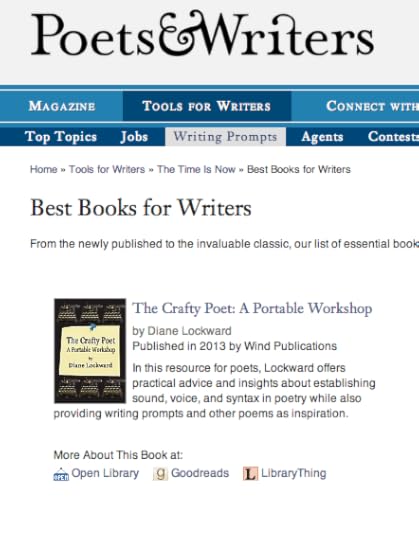 I am thrilled to have my book The Crafty Poet listed as a Best Book for Writers. This recommendation appeared not only in the newsletter but also at the P&W website where it will remain.