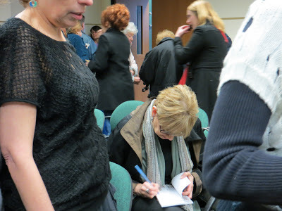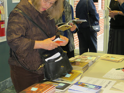 I divide the reading into two parts, with a 15-minute break in the middle. That gives everyone a chance to browse the books and buy some. For the first few Girl Talks I invited all the readers with books to include one title for sale. However, starting last year I limited the book titles to more recent ones so the sale would be more manageable for the volunteers. This seemed to stimulate more rather than fewer sales. Fewer choices make for easier decisions? To stimulate book sales, each year I contribute copies of a craft book or anthology for a lottery. For each book a person buys, she puts her name in the basket. At the end of the day, there's a drawing. This year I gave away five copies of Wingbeats: Exercises & Practice in Poetry.