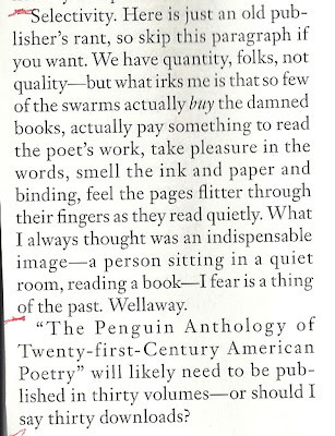 What Zimmer regrets about this proliferation of poets and poetry books is the loss of selectivity. There is simply too much. Ironically, in spite of a plethora of poetry books to choose from, way too few readers and writers of poetry invest in poetry books. Here's an excerpt from the article: