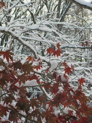 Here's a picture of today's snow. Pretty, yes? But I'm sure I'm not the only one who thinks a second storm was a bit too cruel.