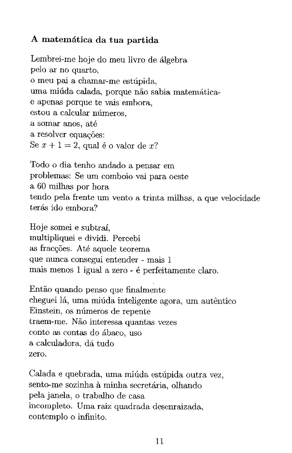Several months ago I was contacted by Francisco Craveiro, a mathematics professor from the University of Coimbra in Portugal. It turned out that in addition to things mathematical he also enjoys poetry and translation. He especially likes poems with math-related subject matter. From time to time he gathers such poems together, translates, and compiles them in a chapbook which he reproduces and distributes. He had come across my poem, "The Mathematics of Your Leaving," from my first book, Eve's Red Dress. I don't know where he found the poem, but it first appeared in Rattle. Now while Rattle is a print journal the editor had also posted the poem on the journal's website, so perhaps that's where Francisco found it.