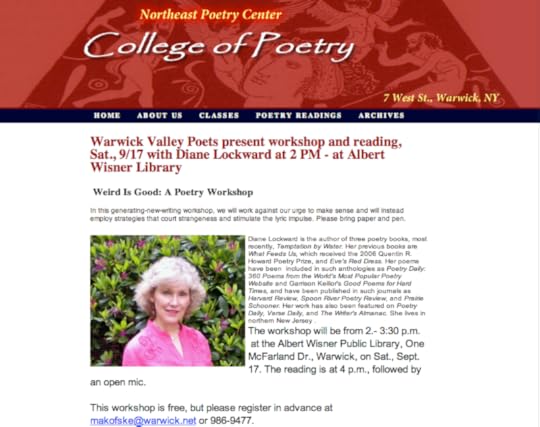 The review begins, "The temptation to read Diane Lockward's latest book, Temptation by Water, as the final volume of a trilogy, building on her two previous full-length collections, Eve's Red Dress (Wind Publications, 2003) and What Feeds Us (Wind Publications, 2006)—proves as irresistible as her luscious homage to peach, "Prunis Persica." The books, with striking cover art by Brian Rumbolo, complement each other physically and share the same gutsy, intelligent voice, forthright exploration of a deeply particular human life, and lavishly precise language." Read the entire review HERE. While you're there, be sure to check out the poetry.