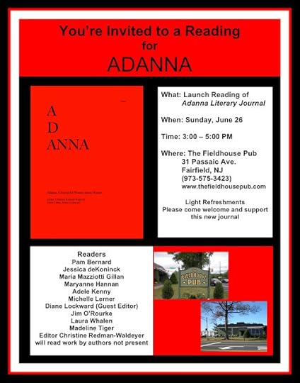 The launch reading for Adanna was held this past Sunday, June 26, at The Fieldhouse Pub in Fairfield, NJ. Although the contributors for the first issue cover the globe, we were able to get 11 of them to participate in the reading and celebration. Pam Bernard came all the way from New Hampshire while Maryanne Hannon and Laura Whalen came from NY State. Editor Christine Redman-Waldeyer and I, the Guest Editor, sent out tons of invitations. Then we hoped hard that we'd get a good turnout.
