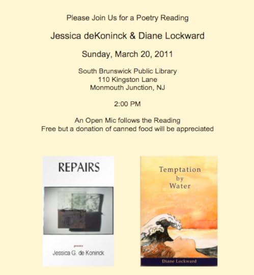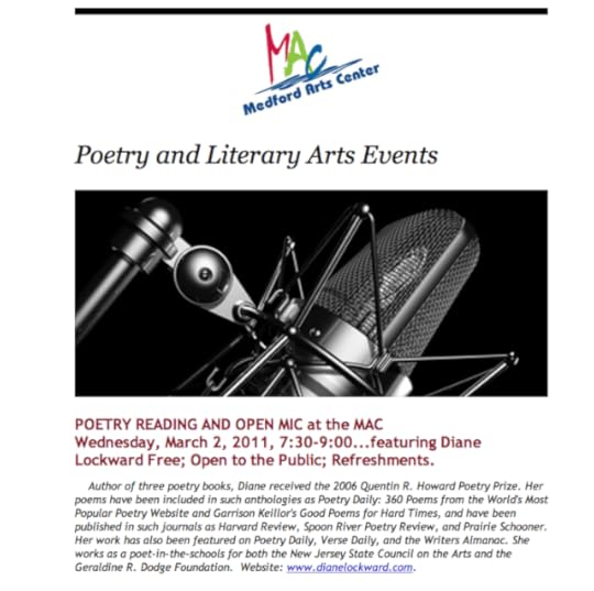 If you live anywhere near Medford, New Jersey, it would be great if you could come to this reading at the Medford Arts Center, Wednesday, March 2, 7:30 PM. Note that there will be refreshments! That means free food!