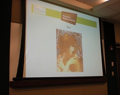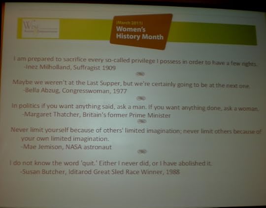 When I was there in 2008, I think there were about 20 people. This year there were over 70! In fact, there was a waiting list. Two screens were set up at the front of the room and power point slides were projected onto them. The one you see below lists inspirational quotations from important women.