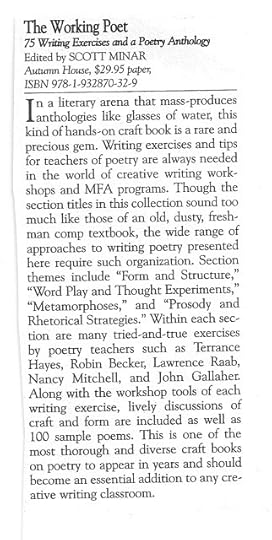 I was delighted to see this brief review in the current issue of The Bloomsbury Review. I agree completely with the recommendation made in the last sentence. But you don't have to be in a classroom to use the book. You can use it to home school yourself. If you don't yet own this, now is the time to treat yourself.