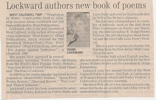 This past week my local newspaper, The Progress, ran an article about my new book. Nothing huge. It's not the New York Times, but it was nice. The neighbors still don't seem to know me or that a poet lives up the street. No one hailed me at the pizzeria Friday night. But a waitress at the diner where my husband gets breakfast told him she'd seen my "advertisement." Advertisement? I've got a dentist appointment this Friday. Maybe Dr. J. will ask for my autograph.