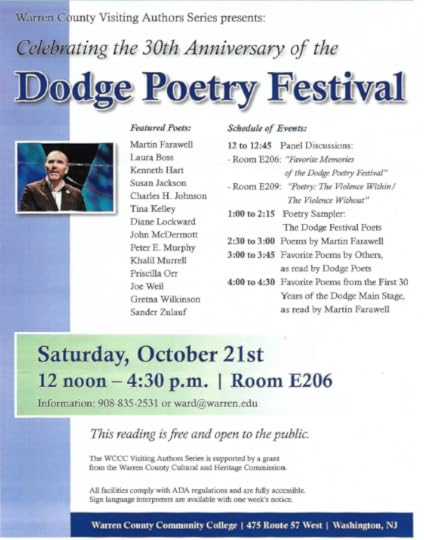 I am thrilled to be participating in this poetry festival on Saturday, October 21. Organized by the fabulous poet and human being BJ Ward, the event includes 13 NJ poets, all of whom have read at past Geraldine R. Dodge Poetry Festivals. The purpose of the event is to celebrate the 30th anniversary of the Dodge Festival. I'll be participating in a panel discussion on "Favorite Memories of the Dodge Poetry Festival" and two Sampler readings. For the first Sampler each of the poets will read 2-3 favorite poems of their own. For the second Sampler, each poet will read one poem by another poet featured at a past festival.