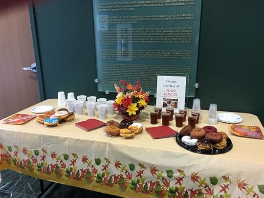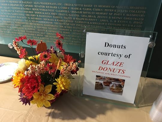 On Sunday, October 15, a group of poets gathered at the West Caldwell Public Library in NJ to celebrate the publication of The Book of Donuts, an anthology published by my press, Terrapin Books. Given that the poets in the book come from places far and wide (e.g., California, Wisconsin, Texas, Indonesia), I was delighted that eight poets were able to participate in the reading. Brent Pallas came from NYC, Anne Sandor from NY State, Marjorie Maddox from PA, and Anne Harding Woodworth came all the way from Washington, DC.