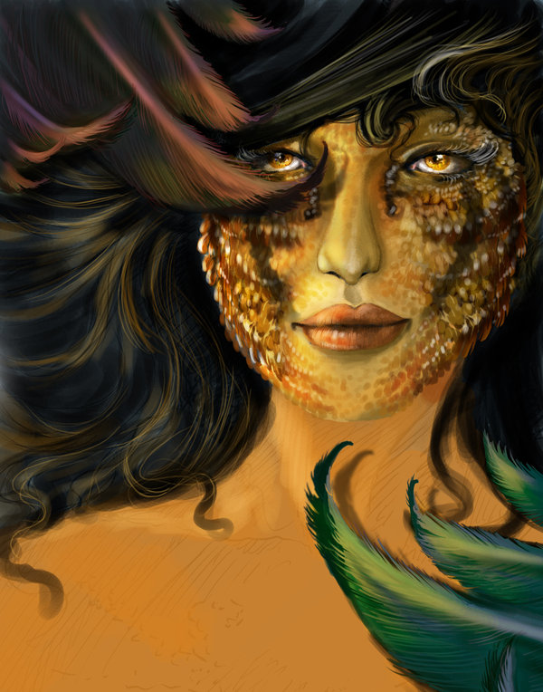 "You're a harpy!" She stared as the woman spread both wings. "But…why so short?" It was not until she realized the wings had been cut at the joint that she regretted the comment. "I'm sorry," she said quickly. "I speak before thinking." She lifted her eyes to the taller woman's face. Black lips smiled back.