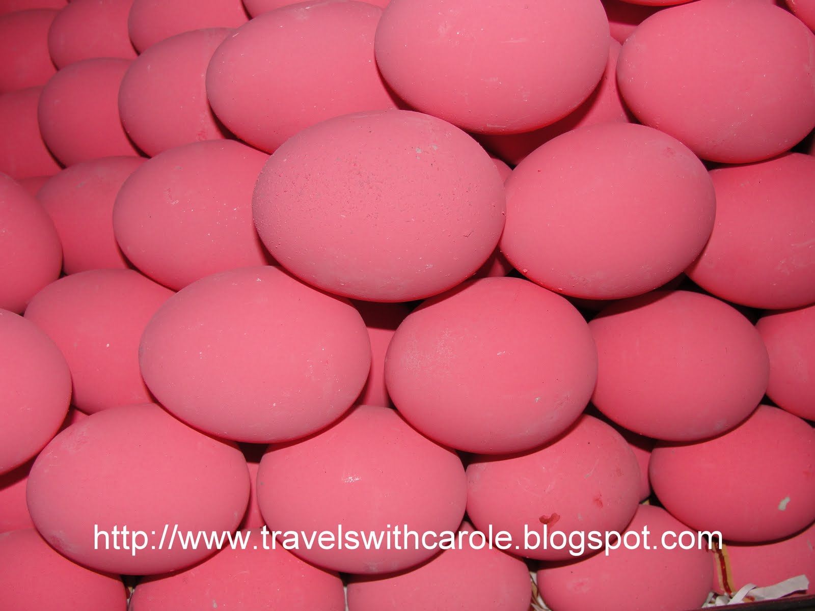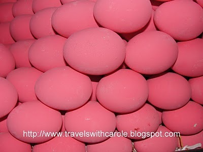 I saw these pretty pink 100-year-old eggs last week in a market just north of Phuket in Thailand. They are actually made fresh but described as rotten beneath the shell. Yum, yum!
