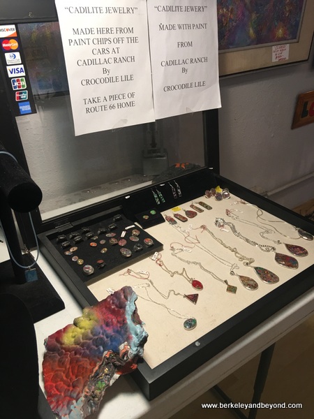 ● Lile Art Gallery 2719 SW 6th Ave. (Old Route 66), (806) 664-3089. This gallery displays the work of local artists as well as owner Bob “Crocodile” Lile’s exclusive line of cadilite jewelry made from the paint layers that peel off the town’s famous Cadillacs. A lovely Australian Shepard, Lady, keeps watch at the door. Lady likes to greet people and is especially fond of little girls.