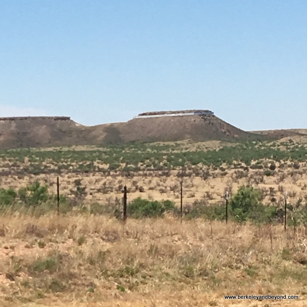 ●Floating Mesa Located a short drive NW of town, just E of the junction of State Hwy. 1061 & State Hwy. 2381. The highway leading to this 1981 installation by Stanley Marsh 3 continues on to Colorado and was the original trail used by cowboys herding their cattle there. An illusion that the top portion of the mesa is floating occurs when the sun reflects just so, which happens whenever the sky is clear--with no overcast and with just the right amount of white. Then, the line of white plywood that was inserted appears to blend in with the sky behind the mesa, and the mesa appears to be floating.