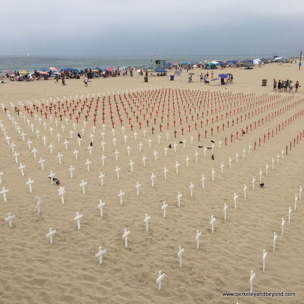 ● war memorial : Each Sunday from sunrise to sunset, a temporary memorial of crosses appears in the sand below the pier.