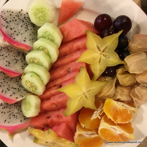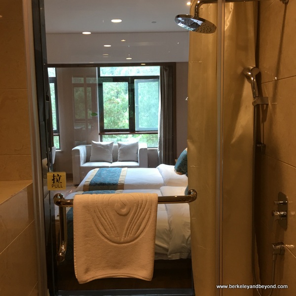 The simple, pleasant hotel provides rooms with a restive view of pine trees, plus operable windows that let in the sweet fragrance of the pines as well as the soft sound of a river below. (This peace was broken early one morning by loud firecrackers and lights in the woods. Though I found this scary, it turned out to be the arrival of a boisterous group celebrating a wedding.) Guest rooms have natural wood floors, comfortable beds with white duvets, and a shower with a clear window looking into the bed area and on to the outdoors through the windows beyond. And, surprisingly, Wi-Fi is free.