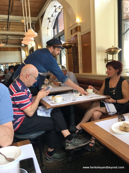 Lafayette 380 Lafayette St., b/t 4th St & Great Jones St., NoHo, (212) 533-3000. This spacious and elegant French grand cafe and bakery is an air-conditioned oasis on a hot NYC day and makes the perfect lunch stop. The complimentary bread and butter is exceptional, and I could have happily made a meal of just that--perhaps with a small salad. I chose a Jambon Cru Baguette which was actually a delectable ham sandwich made especially delicious with a French baguette enhanced with stone-ground mustard and cornichons¬. Oh yeah! Next time I think I’ll try the L’Italien with mozzarella, rapini, and peperonata. Salads, entrees, and more are available. I made room for a ring ding dessert that rang my bell--a devil’s food cake with vanilla filling fashioned after a similarly named popular common version--but macarons in many flavors were also an option. Next time.