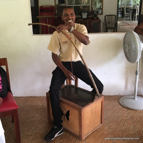 with nephew accompanying on an unusual box bass made by his uncle. The bass had a curved, harp-like bamboo reed with a single string.