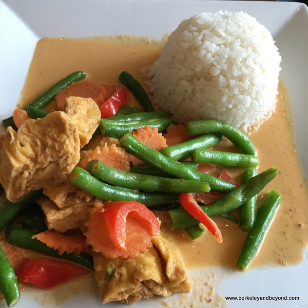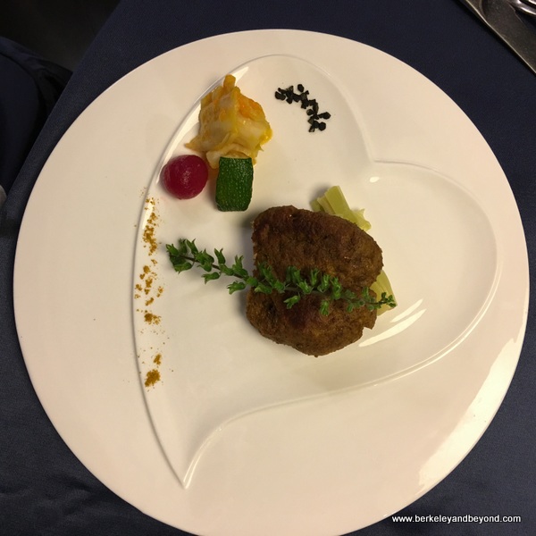 6-hericium mushroom filet (grilled, then baked) served with curry sauce, fresh seasonal vegetables, and boiled corn